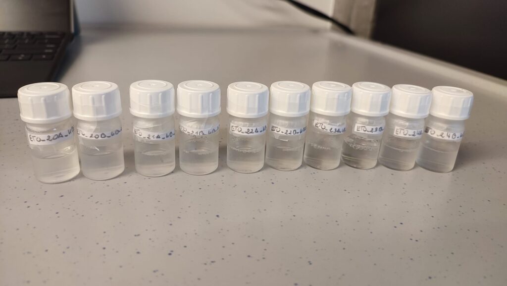 Na pierwszy rzut oka przezroczyste zawartości probówek mogą wydawać się zwykłymi roztworami. W rzeczywistości kryją one jednak w sobie zaawansowane nanoformulacje lipidowe, opracowywane w ramach naszego projektu badawczego.