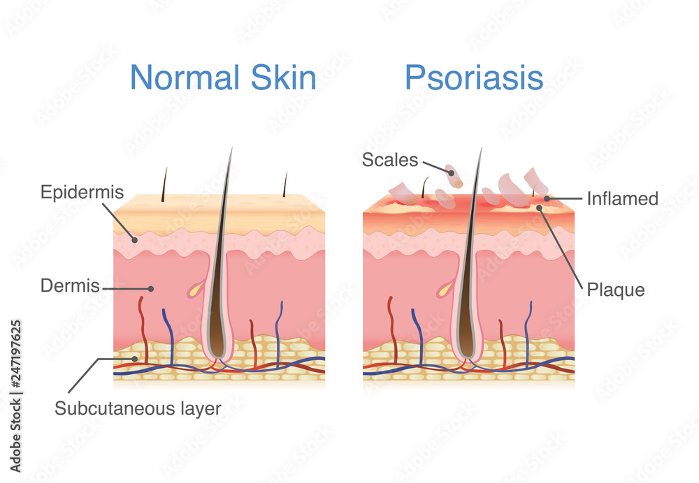 Efektem jest skrócenie cyklu odnowy naskórka z około 28 dni do 3-5 dni, powstawanie nadmiernej warstwy rogowej oraz nasilona angiogeneza w obrębie skóry.